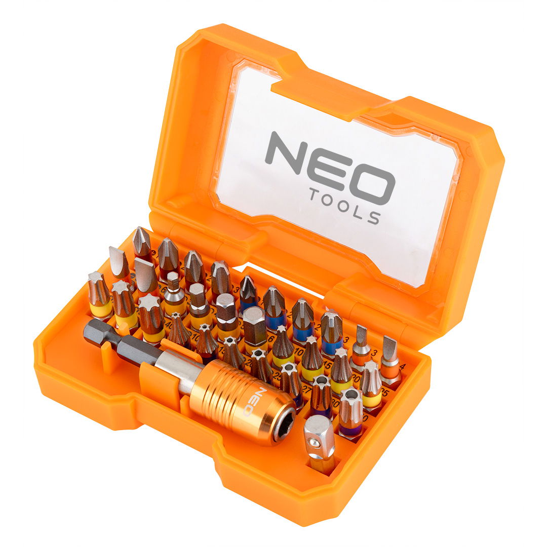 NEO 1/4"-os, 32 részes csavarhúzó bit készlet. Az alkalmazott S2 acélötvözetnek köszönhetően a hegyek keménysége eléri a 60 HRC értéket, ami jelentősen megnöveli élettartamukat és a velük végzett munka minőségét. A készlet 25 mm hosszú lapos, kereszt, imbusz, Torx, furatos Torx bitek bő választékát tartalmazza. A bitek mágneses heggyel rendelkeznek. A készletet bit befogó és dugóadapter egészíti ki. A termék kiváló minőségét és megbízhatóságát bizonyítja a TÜV Rheinland tanúsítvány. A NEO márka a professzionális igényeket is kielégíti.