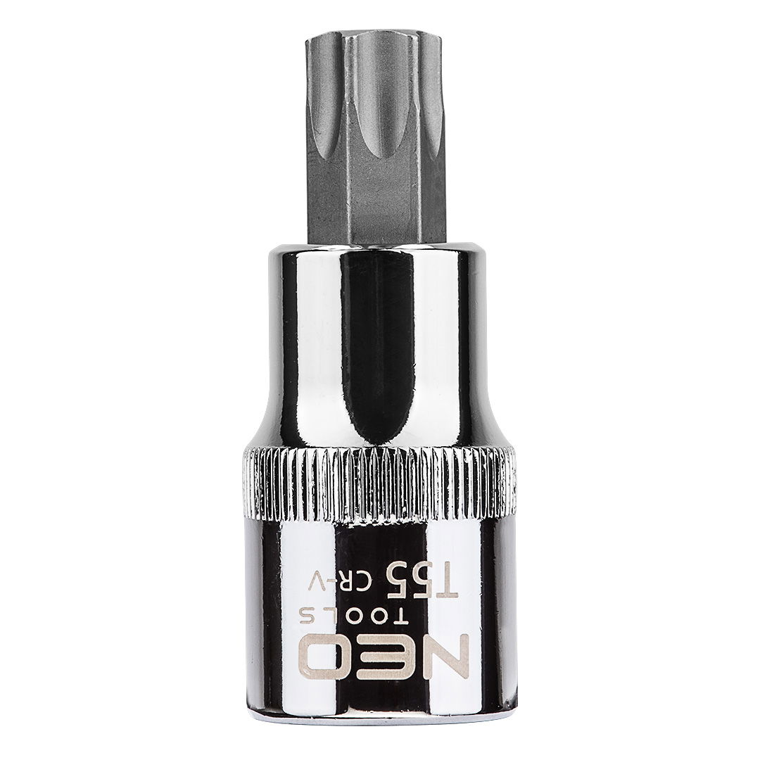 NEO 1/2"-os Torx bit dugókulcs, 55 mm hosszú. A dugóadapter nagy ellenállóképességű króm-vanádium acélból , a Torx bit pedig S2-es acélból készül. A hatlapú bit kiváló minőségű S2 acélötvözetből készül. A szerszám minőségét bizonyítja a TÜV tanúsítvány és a gyártó által nyújtott 25 éves jótállás. A NEO márka a professzionális igényeket is kielégíti.