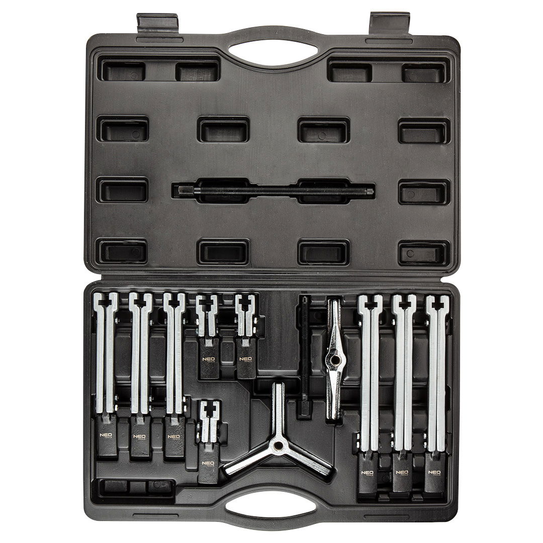 NEO csapágylehúzó készlet. 100, 200, 250mm -es cserélhető karokkal. 22 darabos készlet csapágyak, agyak és fogaskerekek lehúzásához. A készlet elemei lehetővé teszik a 2- és 3-karos húzókészülék összeszerelését, mind belső, mind külső kihúzási munkákhoz. A készlet 12 különböző lehúzót képes helyettesíteni. A készlet egy műanyag kofferbe van csomagolva.