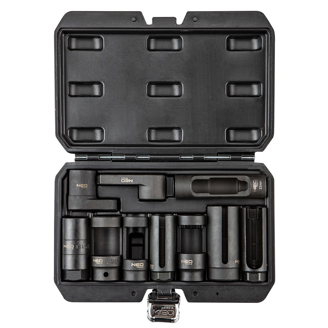 NEO injektor és lambdaszonda szerelő készlet, 10 db-os. Speciális dugókulcsok lambdaszondákhoz és injektorokhoz. Lehetővé teszi a különböző típusú lambdaszondák és injektorok szervizelését a népszerű márkák autóiban. A Neo márka a professzionális igényeket is kielégíti.