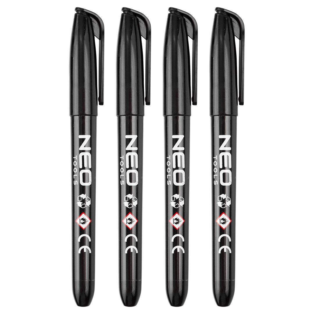 NEO 13-856 4db jelölőfilc, vízálló olajalapú festékkel, használat előtt felrázandó, fekete, normál hegyű.Építőipari filctoll, fekete, tartós, vízálló, olajbázisú. Egy 4 darabos készlet, 4 mm átmérőjű kerek hegyű építőipari filctollal. A markert fekete olajfesték jellemzi. Olajalapú, tartós, gyorsan száradó és vízálló. Kiválóan használható különféle felületeken, többek között fémen, üvegen, kövön, fán és műanyagon. Professzionális és otthoni használatra egyaránt ajánlott.