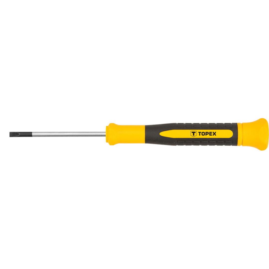 A TOPEX lapos műszerész csavarhúzó kiválóan beválik szerelési, barkácsolási munkákban. Hegye nagy ellenállóképességű, a szerszámnak hosszú élettartamot biztosító króm-vanádium acélból készült. Az edzett acélból készülő mágneses hegy megkönnyíti a szerszámmal végzett munkát A forgó feltétje funkcionalitását bővíti, lehetővé teszi a szerszám pontosabb vezetését. Az ergonómikus, csúszásmentes anyaggal bevont műanyag markolat biztosítja a kényelmet és a biztonságot a munkavégzés során. A TOPEX márka ezermestereknek készül.