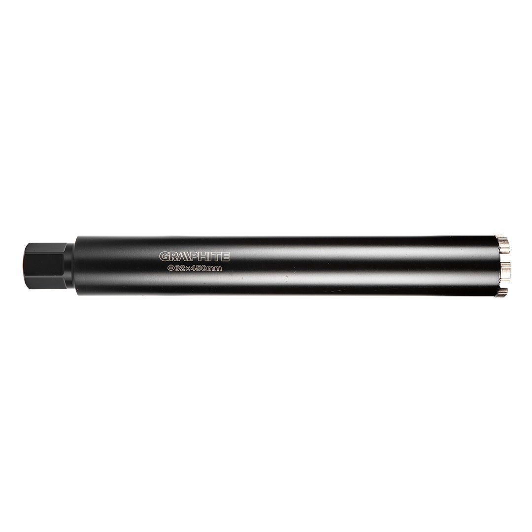 GRAPHITE 57H859 Gyémánt magfúró korona, 62x450mm, 6 szegmenses, 58G540 magfúrógéphez. 6T fogakkal rendelkezik, amelyek szegmens magassága 10 mm, és 1,1/4"-os menettel rendelkezik. A géptartozék robusztus acélból készült, varrat nélküli csőből és lézerhegesztett fogakkal rendelkezik. Nélkülözhetetlen beton, vasbeton, kerámia, gránit vagy aszfalt megmunkálásakor. Professzionális használatra, valamint különféle barkácsolási feladatokhoz ajánlott.