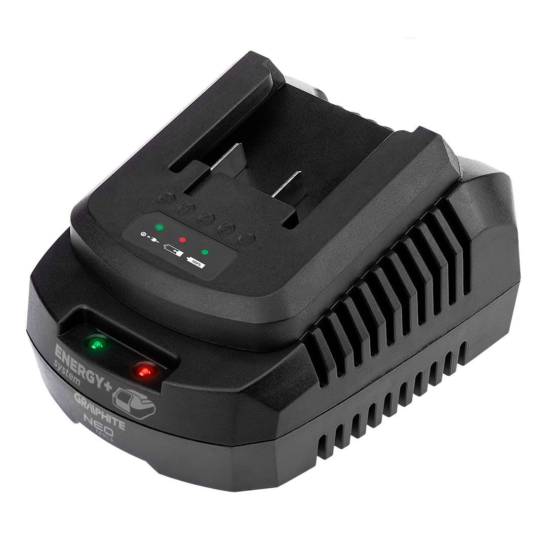 GRAPHITE 58G002-1 AKKUMULÁTOR TÖLTŐ, ENERGY+ EGYAKKUS RENDSZERHEZ, 65W, 2,4A. 1 óra töltési idővel az 58G001 esetében, 2 óra az 58G004 esetében és 3 óra az 58G086 esetében. LED jelzi a csatlakoztatott akkumulátort, a folyamatban lévő töltést vagy a töltés végét. A töltő feszültség- és hőmérséklet-szabályozó rendszerrel van felszerelve az akkumulátor és a felhasználó teljes védelme érdekében. A készülék rugalmas és robusztus tápkábellel rendelkezik, professzionális és ipari alkalmazásokhoz is ajánlott, beltéri és kültéri használatra egyaránt.