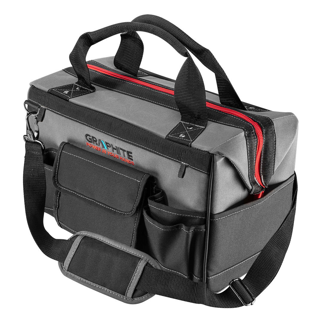 GRAPHITE géptartó táska Energy+ akkus és hálózati gépekhez, tartozékokhoz. Űrtartalma 18,5 l. Nagy szövetsűrűségű, a kopásnak jól ellenálló anyagból készül. A belső oldalon laminált poliészter anyag óvja a táska tartalmát a nedvességtől és a kedvezőtlen időjárási körülményektől. 7 külső, 8 nagyméretű belső zseb és 2 szerszámtartó akasztó. Az akasztók lehetővé teszik a fúró-csavarozó szerszámok (fém akasztó), vagy mérőszalag (textil akasztó) rögzítését. A táska alja merevített, vízálló, talpakkal, mely a nehéz munkakörülmények között is védi a táska tartalmát A táska méretei lehetővé teszik több elektromos szerszám és tartozékainak (akkumulátor, akkutöltő, külön kiszerelés) komfortos hordozását.