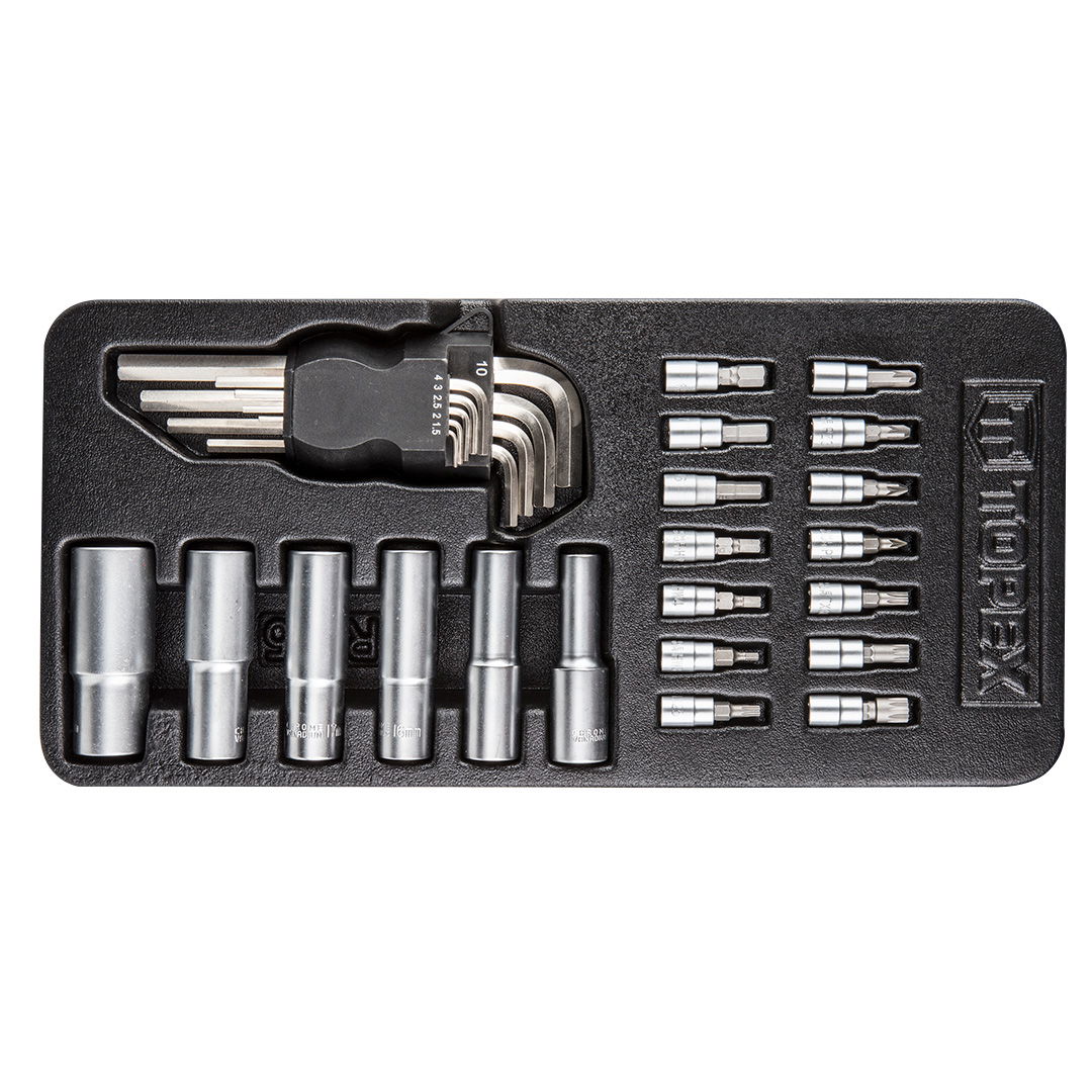 Topex Bit, dugókulcs és imbuszkulcs készlet, műhelykocsi tálcával. 29 db. (ref.sz. 79R515) univerzális szerszámkészlet több szerszámcsoportot tartalmaz: imbuszkulcsokat, dugókulcsokat és biteket, valamint hatszögletű dugókulcsokat. A készlet műanyag tokban elrendezve. A TOPEX márka ezermestereknek készült.