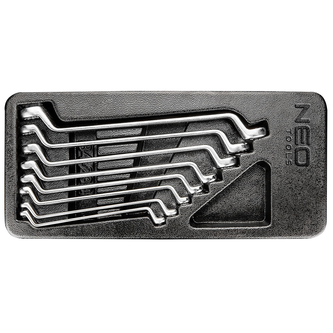 A NEO hajlított csillag kulcskészlet, (Ref.sz. 84-233) 8 darab normál méretű kulcsot tartalmaz, amelyek 6 - 22 mm-es tartományban mozognak, és a DIN 838 szabvány szerint készültek. A kulcsok kimagasló minőségű króm-vanádium acélból készültek, ami biztosítja a kulcsok sokéves tartósságát és megbízhatóságát.A szerszámokat praktikus műanyag tálcában vannak elhelyezve, amelyek illeszkednek a NEO 84-221 és 84-222 szerszámos szekrények fiókjaihoz. A termék megbízhatóságát a gyártó 25 éves garanciája is alátámasztja, így hosszú távú használatra tervezve.A méretek a következők: 6x7mm, 8x9mm, 10x11mm, 12x13mm, 14x15mm, 16x17mm, 18x19mm, 20x22mm, profilozott betét. A NEO márka elkötelezett a professzionális igények kielégítése mellett, és minőségi termékeivel szolgál a szakemberek számára.