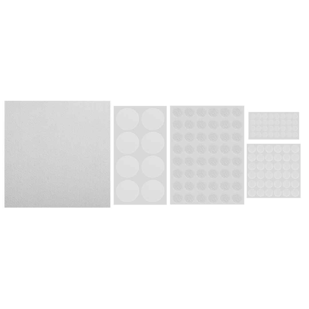 TOPEX 98Z150 BÚTORLÁB FILC ÉS SZIVACS KÉSZLET, ÖNTAPADÓS, 125DB-OS. Praktikus bútoralátétek, amelyek megakadályozzák a padló karcolását. Puha EVA habból és filcből készülnek. Különböző konfigurációkban 125 darabos készletben kínálják: 32 db 10 mm átmérőjű EVA-darab, 1 db 20 x 20 cm-es filcdarab, 48 db 20 mm átmérőjű filcdarab és 36 db 15 mm átmérőjű filcdarab - mindegyik 3 mm vastag. Robusztus, univerzális fehér színben.